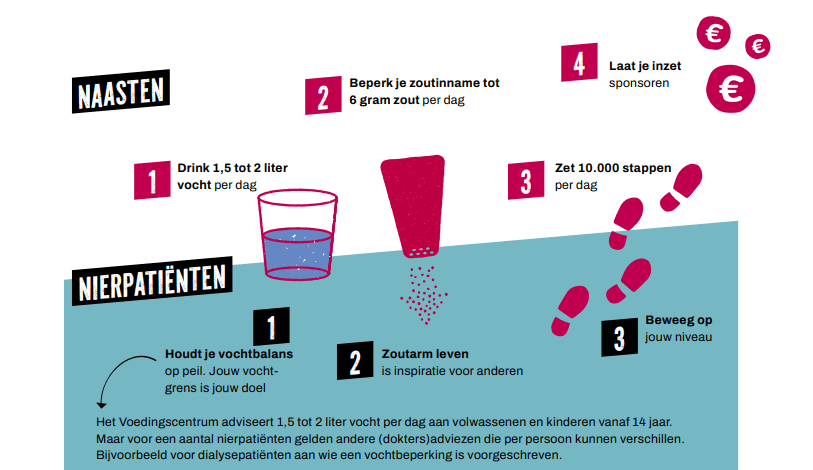 De Nierkracht Challenge is een krachtige uitdaging waarbij je werkt aan je eigen gezondheid, bewustwording creëert over de impact van nierziekten én geld inzamelt voor nieronderzoek en een beter leven voor mensen met nierschade. Het gaat om 10 dagen vol actie: drink genoeg water, eet minder zout en zet elke dag 10.000 stappen. De challenge vind plaats van 12 t/m 21 september, in de week van nieren. Ook nierpatiënten kunnen meedoen: voor hen is er een aangepaste variant.