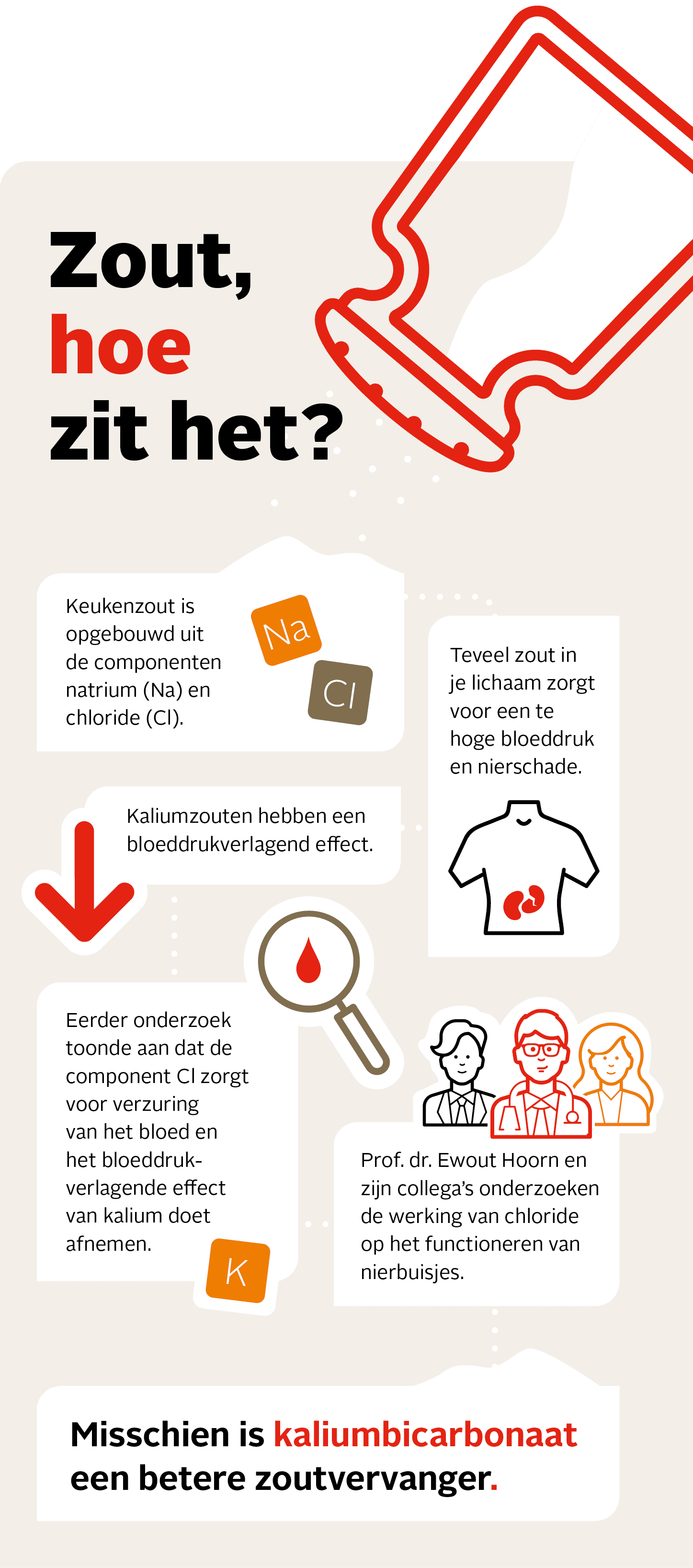 Ook ontdekte Hoorn iets verrassends. De effecten van natrium in keukenzout zijn breed onderzocht, maar chloride is weinig bestudeerd. Hoorn deed dat wel. ‘Toen ontdekten we iets nieuws. Namelijk dat chloride bij nierpatiënten leidt tot verzuring van het bloed. En dat kan weer nierschade veroorzaken. Ook nam het bloeddrukverlagende effect van kalium af.’