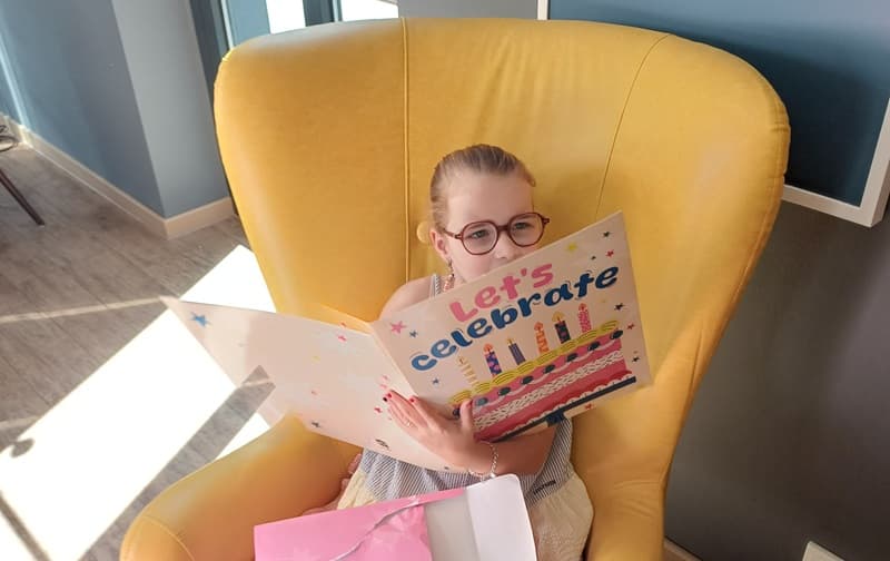 Om 16.00 uur was het tijd voor feest, samen met iedereen van de New Wings Foundation. Indy werd overladen met cadeautjes en straalde helemaal ✨. De grootste verrassing? Een enorme kaart waarin iedereen speciaal voor haar een boodschap had geschreven – zó bijzonder ❤️.