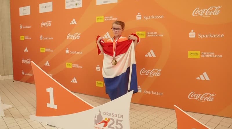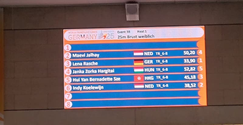 Om 13.17 uur begon de 50 meter rugcrawl. Bij het startsein schoot Indy weg – het leek zelfs een fractie te vroeg, maar ze werd niet afgekeurd. En wát een race… ze knalde door het water en iedereen stond versteld. Ze won gewoon goud! 🥇