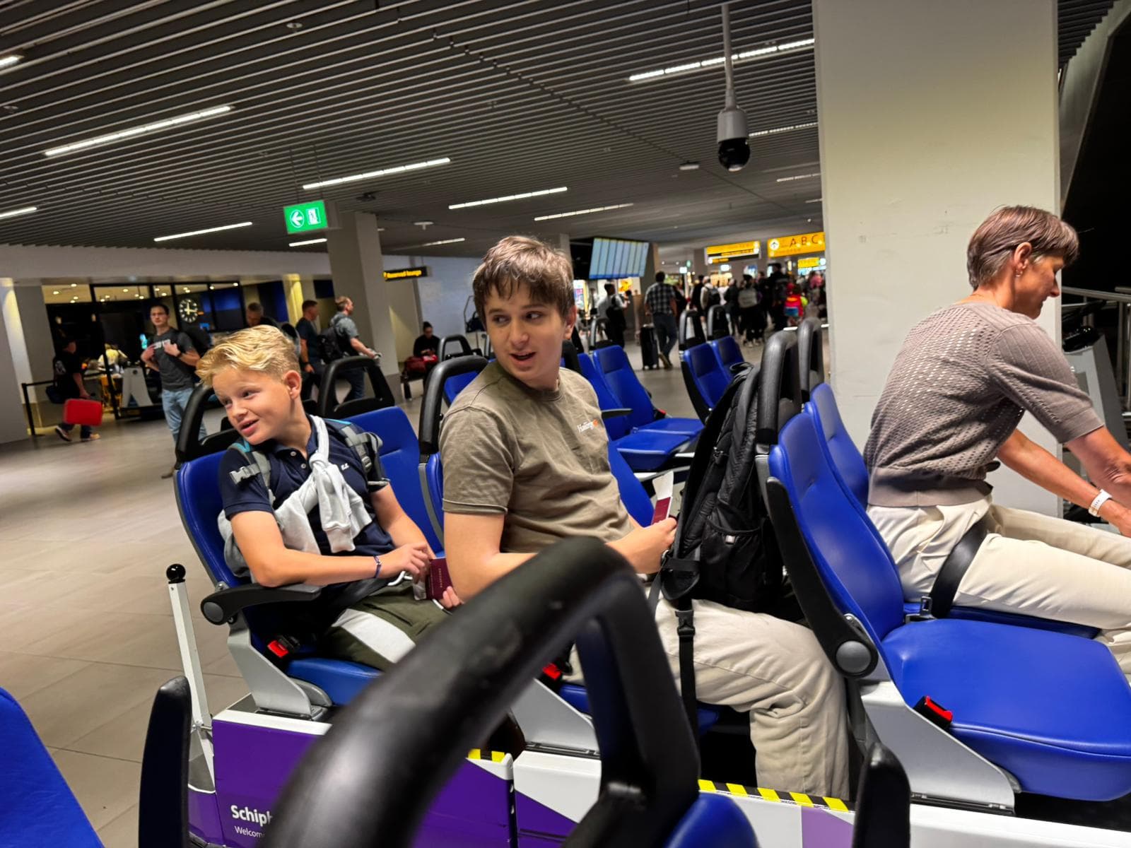 Met veel plezier werden we rondgereden in een caddy naar de gate. Dwars door allemaal wachtende mensen heen. Hoe leuk was dat! Natuurlijk moesten er nog de nodige versnaperingen gekocht worden voordat we in het vliegtuig stapte. Iets later dan gepland gingen we de lucht in.