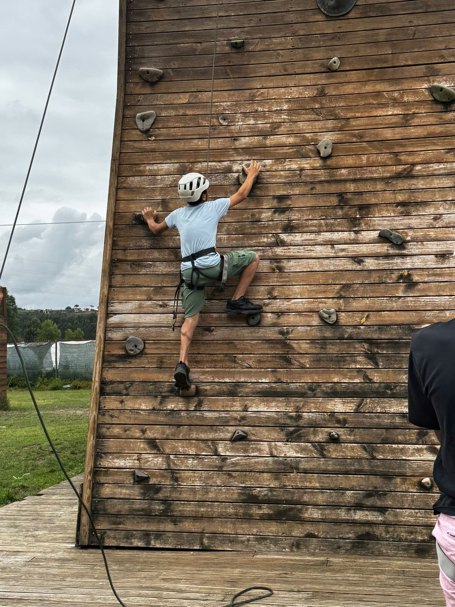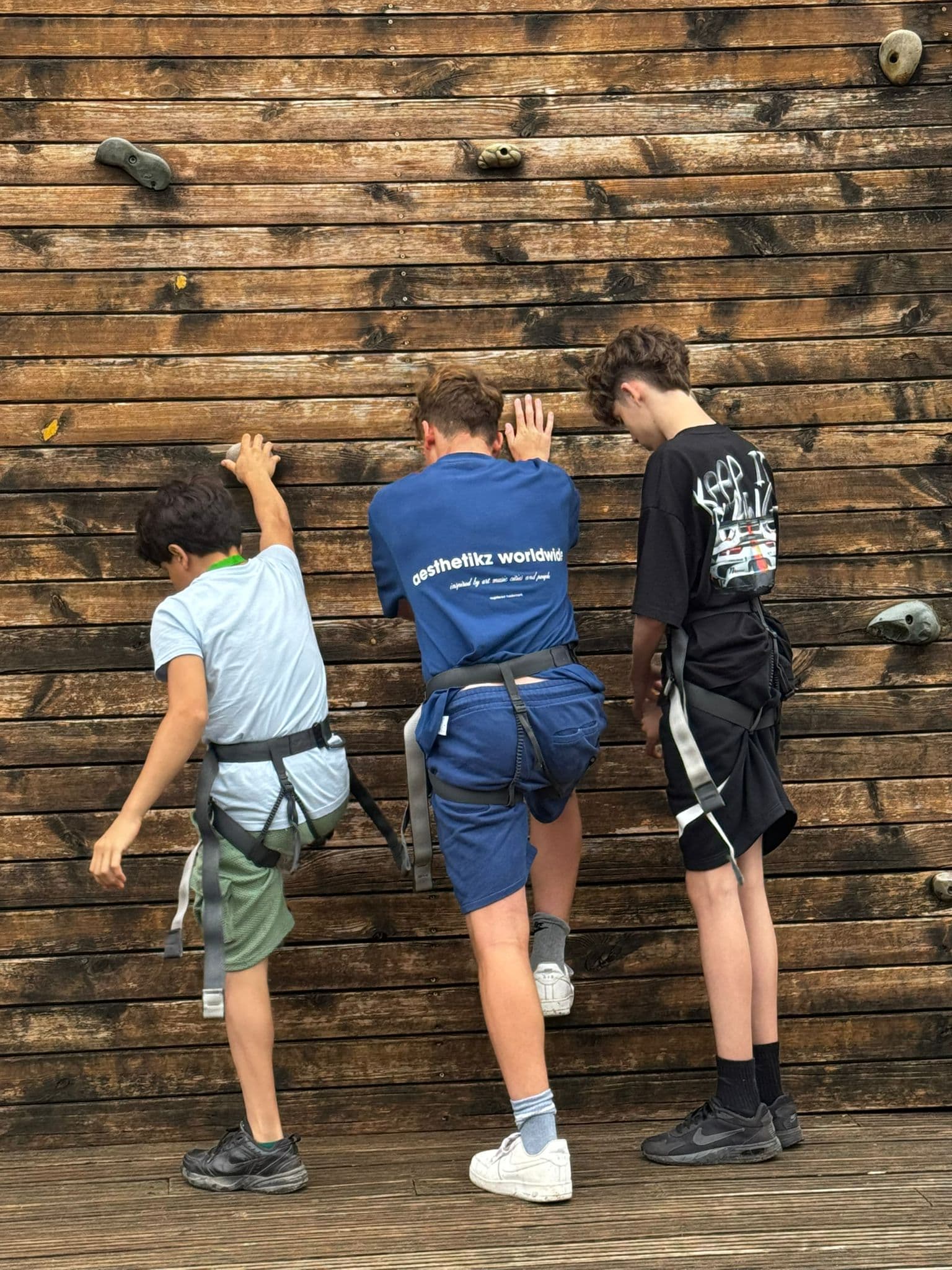 Voor het eerst werden we wakker met regen. Maar gelukkig werd het na het ontbijt droog. Vanmorgen stond zipline en de klimwand op het programma. Na de nodige instructies kreeg ieder een tuigje om en kon via de trap naar boven klimmen. Daar werden ze gezekerd voordat ze met een vliegend vaartje naar beneden gingen. Een leuk gezicht. Vervolgens was de klimmuur aan de beurt. Opnieuw gezekerd en als spidermannen klommen ze omhoog. Wat een helden!