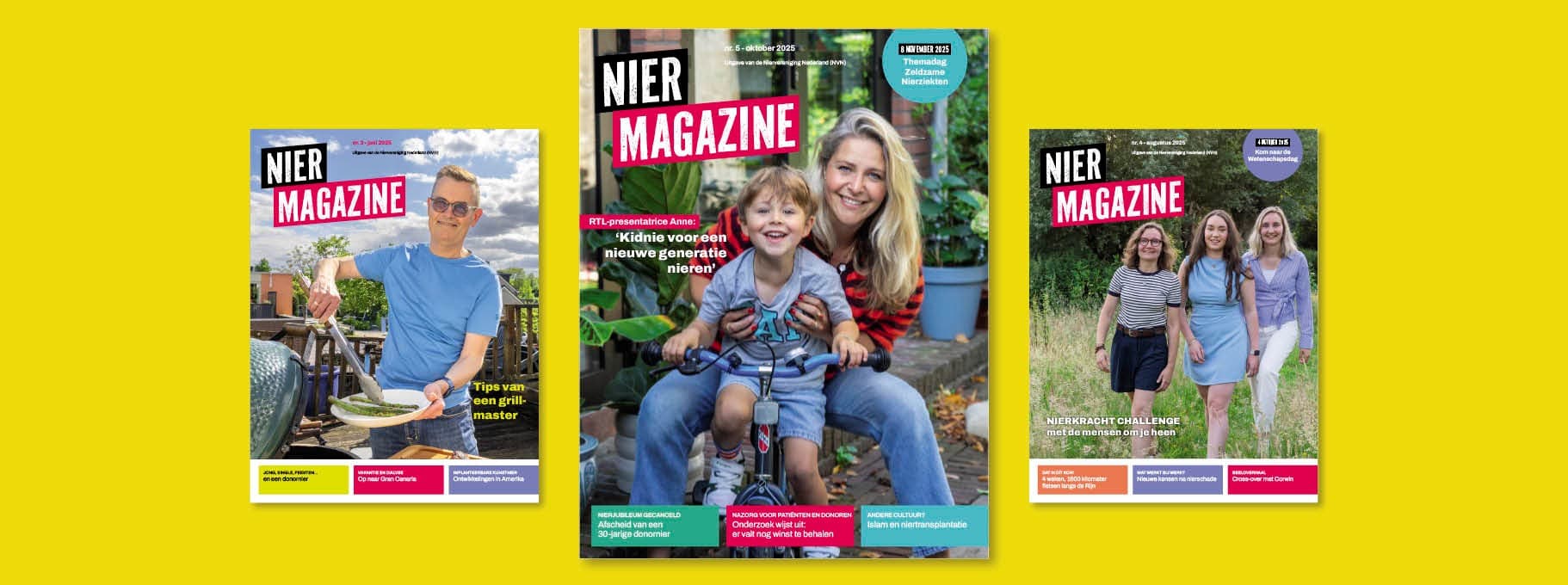 Persoonlijke verhalen van nierpatiënten, wetenschappelijke en (para)medische artikelen, praktische tips, artikelen over actuele politieke ontwikkelingen, de stand van zaken rond nierdonatie en -transplantatie, sport, voeding en andere voor nierpatiënten relevante onderwerpen. Dat lees je allemaal in het tijdschrift van de Niervereniging: Nier Magazine.